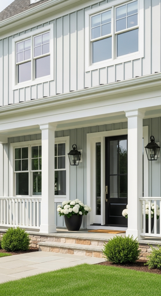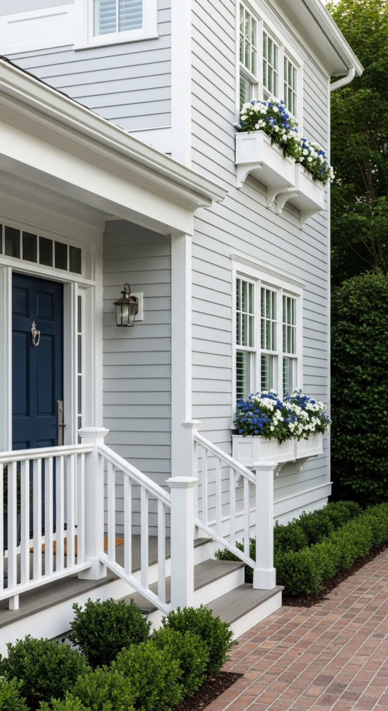 Light, airy, and classic — dove grey siding with crisp white trim is endlessly fresh.