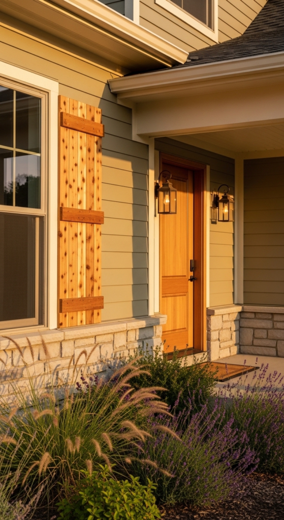 Greige siding warmed up with natural cedar shutters — organic, grounded, beautiful.