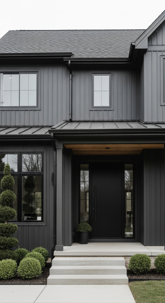 Dark and dramatic — deep charcoal siding beneath a sleek standing seam metal roof.