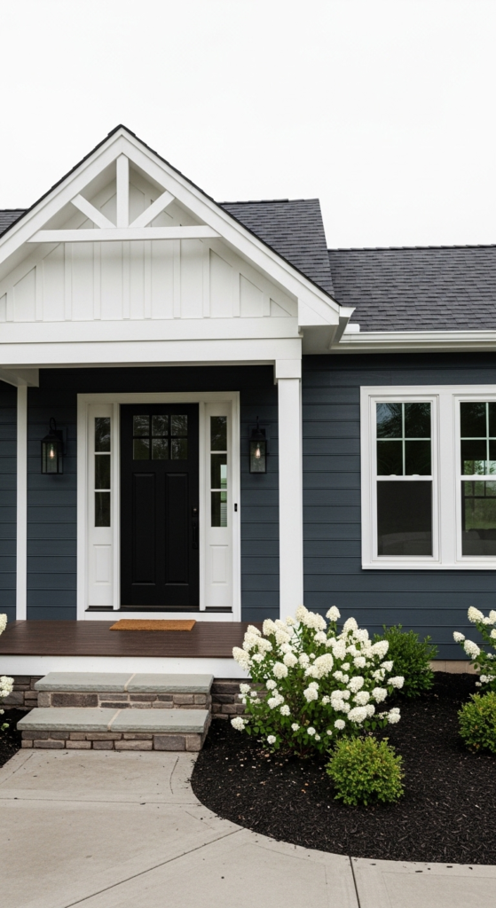 A pop of navy on light grey siding — quietly bold and effortlessly polished.