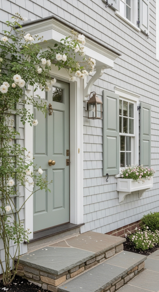 Pale grey siding with sage green shutters and door — the softest, most soothing combo.