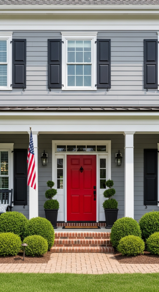 Classic shutters plus a bold red door on medium grey — timeless American farmhouse energy.