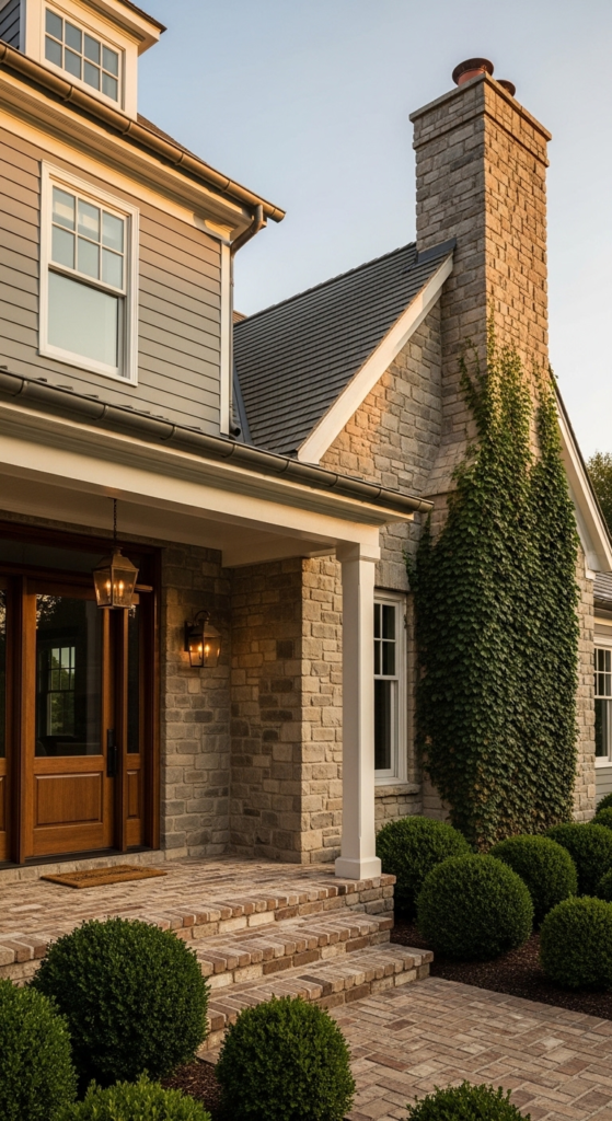 Warm grey siding with mixed stone and brick accents — rich texture, layered and stunning.