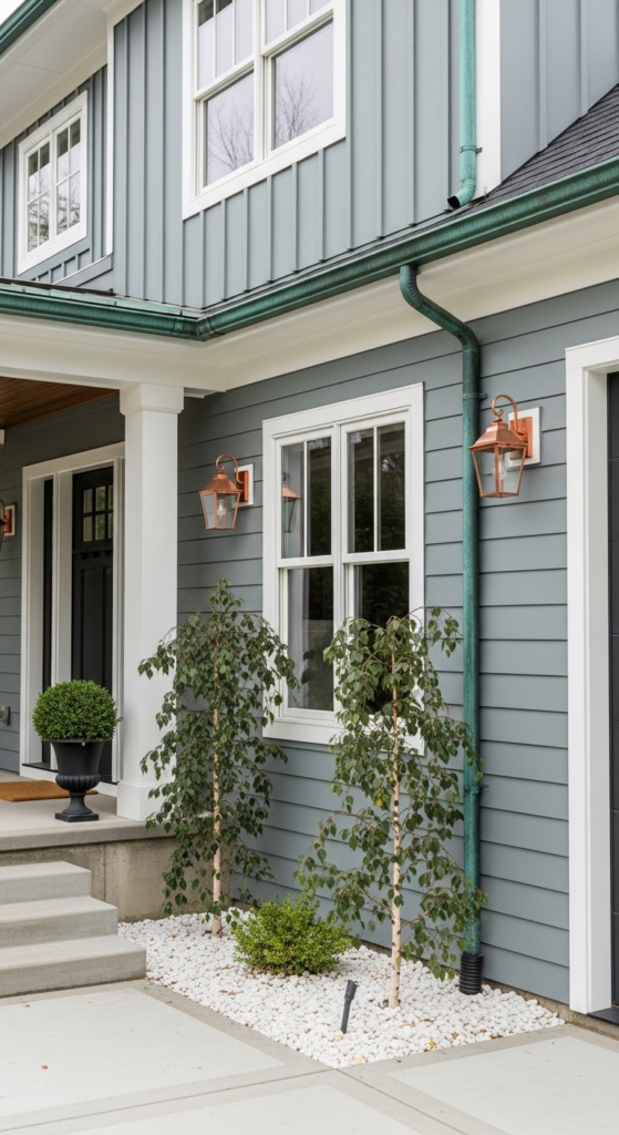 Crisp cool grey siding with aging copper gutters and fixtures — unexpected and gorgeous.