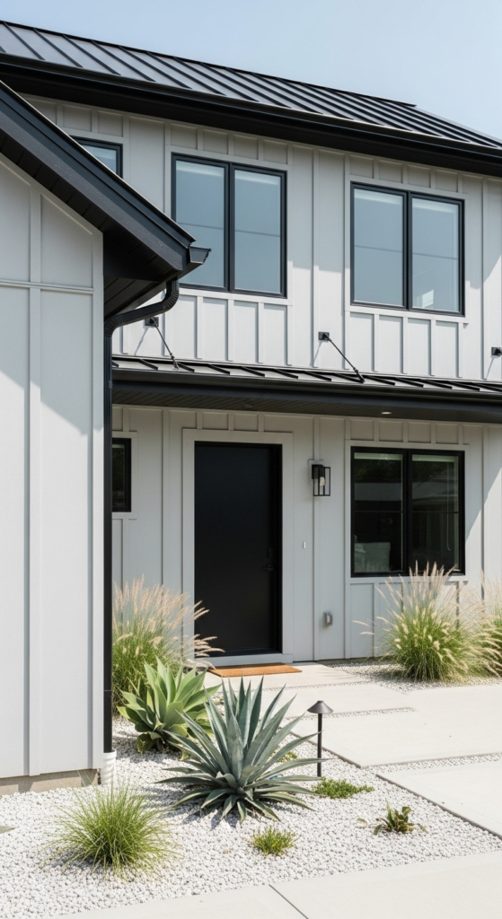 All-black window frames on silver grey siding — striking, graphic, and very on trend.