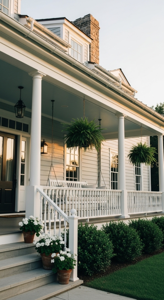 Soft misty grey behind a sprawling white wraparound porch — effortless Southern charm.