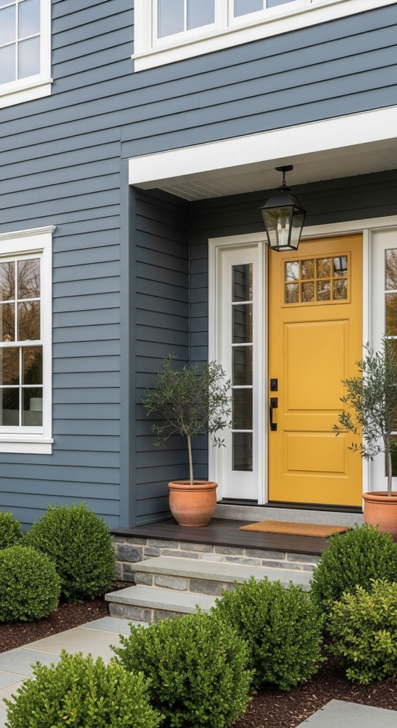 A mustard yellow door on slate grey siding — bold, unexpected, and totally Pinterest-worthy.