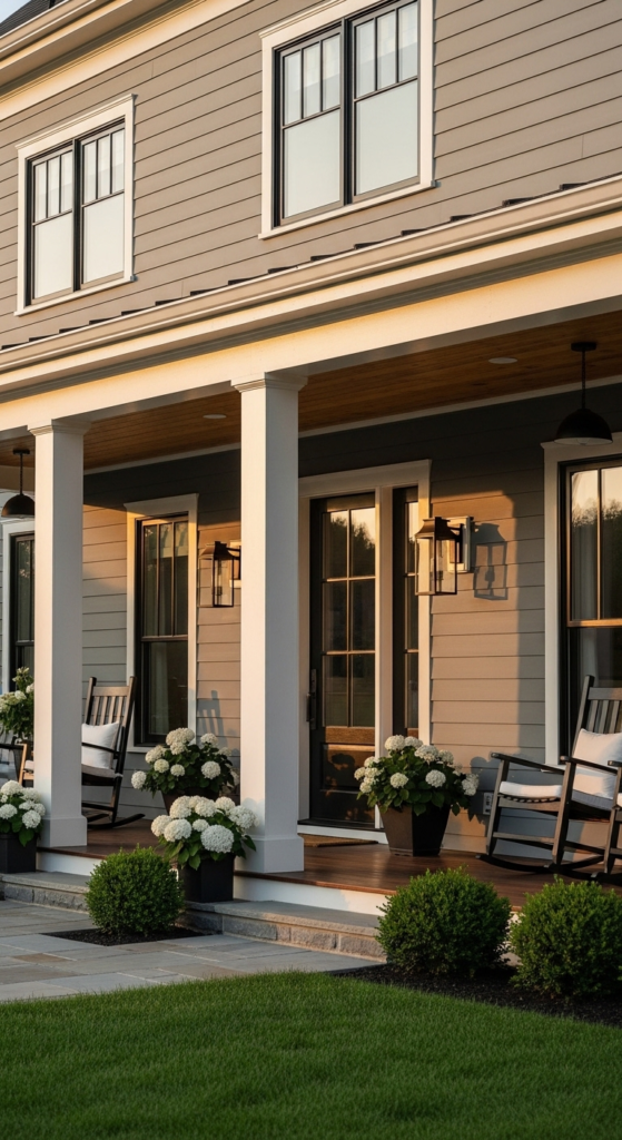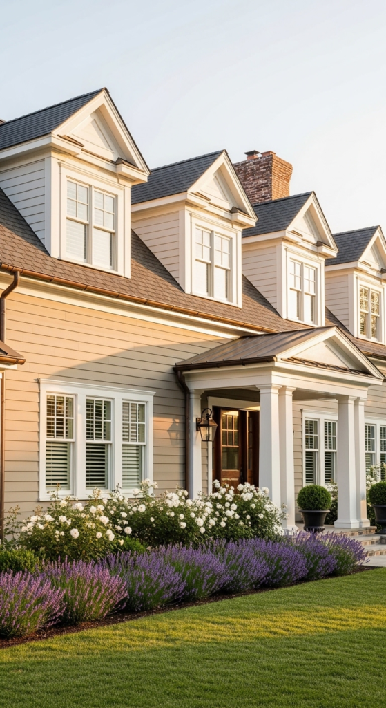 Warm greige body with bright white dormer gables — layered, textural, and stately.