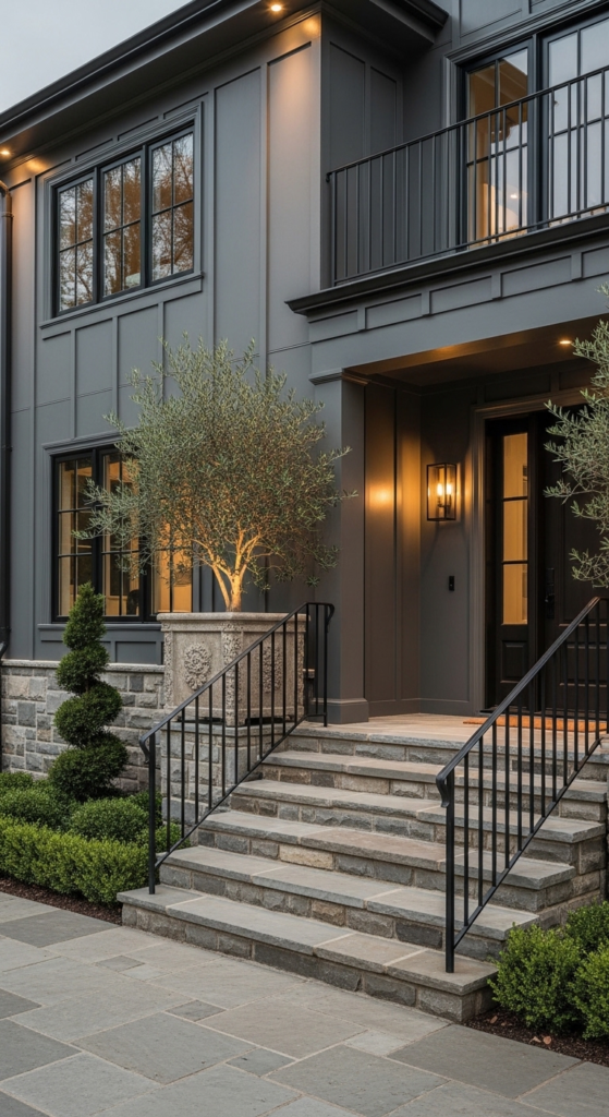 Deep pewter grey siding above natural stone entry steps — raw, refined, and striking.