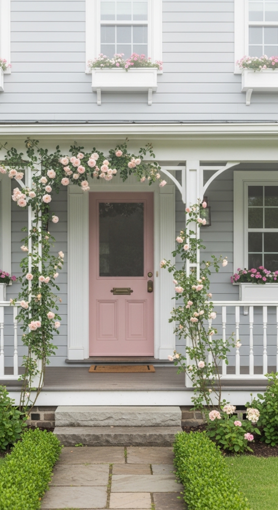 Dreamy foggy grey siding softened by climbing blush roses — the most romantic exterior.