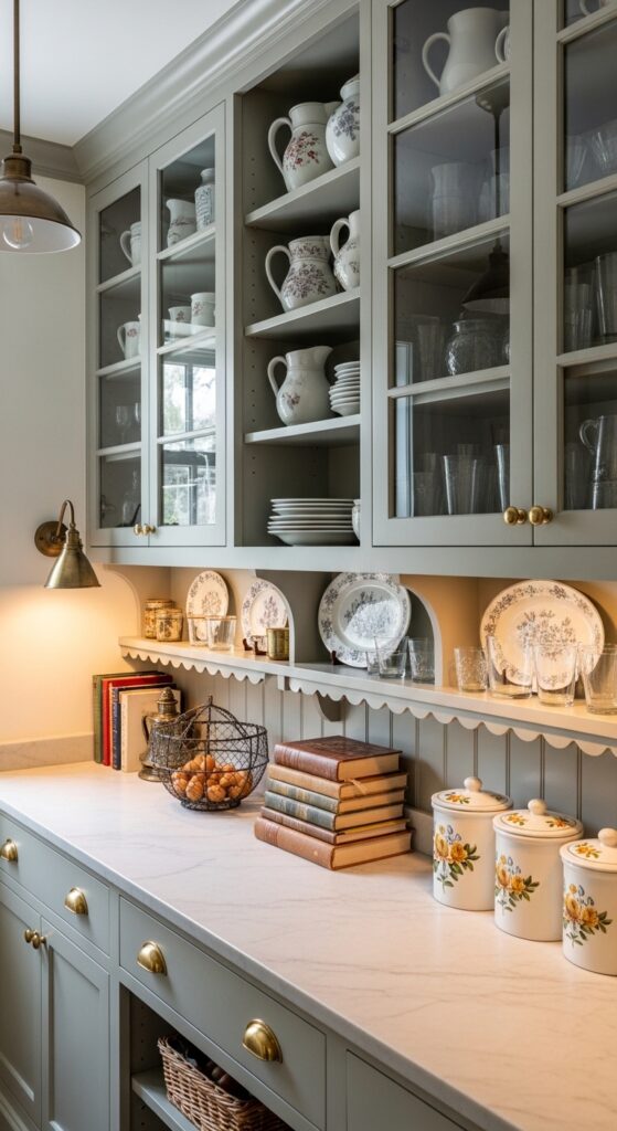 Styling Tips: Install glass-front upper cabinets painted in a muted sage or deep forest green to display your collected ironstone, vintage transferware, and mismatched glassware. Use unlacquered brass hardware — simple cup pulls or bin pulls — throughout. Line the lower shelves with a scalloped-edge shelf liner in cream. Stack vintage cookbooks, tuck in a wire egg basket, and display a hand-painted canister set. A small pendant light in aged brass overhead completes the look.