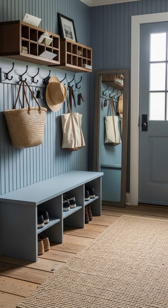 Styling Tips: Build or source a classic built-in mudroom bench with storage below in a painted shiplap style. Mount a row of heavy iron hooks above at consistent height for hanging coats, hats, and woven market baskets. Install small wooden cubbies or pigeonhole shelves above for mail, keys, and everyday items. Paint everything in a muted cream, gray-green, or slate blue. Add a thick natural fiber runner on the floor and an aged mirror beside the door.