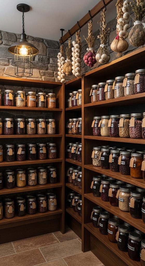 Stone-effect shelves, mason jars lined up in orderly rows, braided garlic, dried herbs, and the cool earthy stillness of a root cellar reimagined as the most beautiful pantry you’ve ever seen.