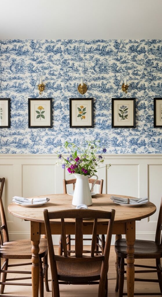 Styling Tips: Choose wallpapers with traditional motifs — blue and white toile de Jouy, soft green botanical florals, or a classic block-printed stripe in cream and terra cotta. Apply it to a dining room, a powder room, or a reading nook for the most dramatic impact. Pair it with simple, understated furniture so the wallpaper remains the star — a plain white or natural wood furniture palette lets the pattern breathe. Add period-appropriate framed portraits or botanical illustrations to layer the narrative.