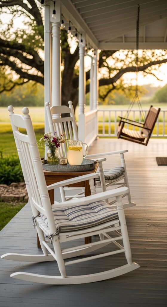 Styling Tips: Paint the porch floor in classic porch gray or a deep hunter green. Choose painted wooden rocking chairs in crisp white or soft sage. Dress them with ticking stripe or faded floral cushions for comfort and color. Add a simple wooden side table between the chairs with a galvanized metal tray, a glass pitcher, and a jar of wildflowers. Hang a classic wooden porch swing at one end and string Edison bulb lights along the porch rafters for evening warmth.