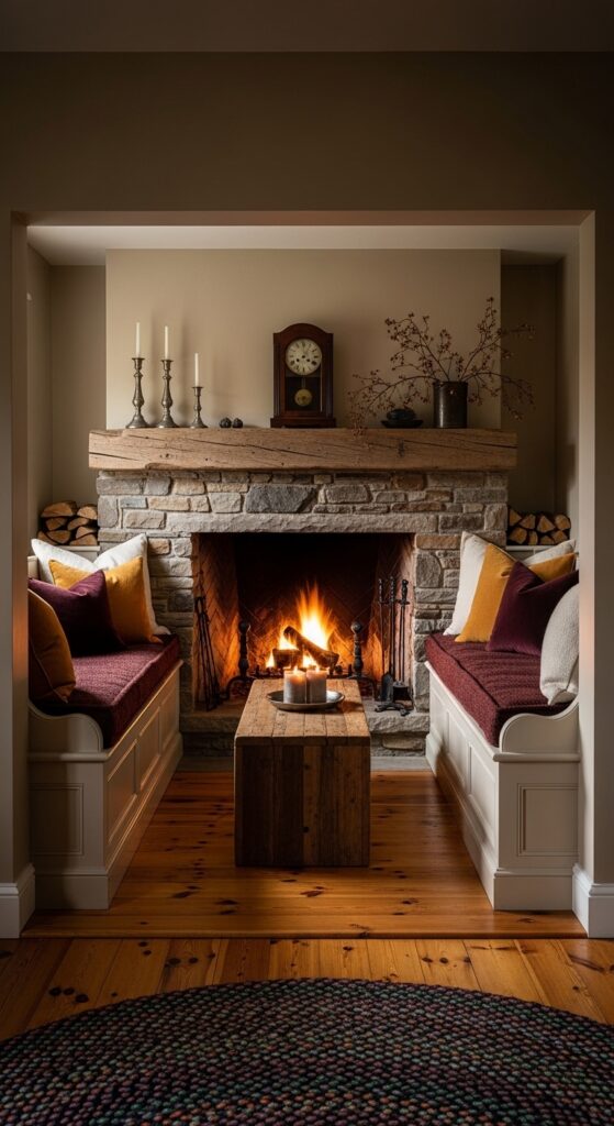 Styling Tips: Build or replicate an inglenook by framing a seating alcove on either side of a stone or brick fireplace with built-in painted wooden benches fitted with thick cotton or wool cushions. Use a mix of woven, printed, and solid cushion covers in warm ochre, deep burgundy, and cream. Add a low wooden coffee table in the center of the nook. Frame the fireplace with a rough timber mantel dressed with pewter candlesticks, a wooden clock, and a single bough of dried botanicals.