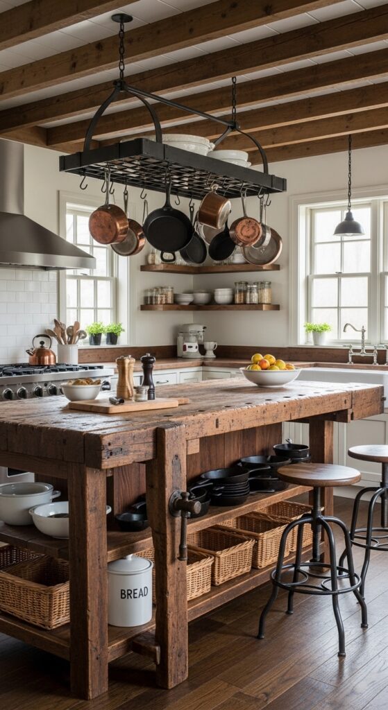 An old butcher’s block or reclaimed barn wood workbench repurposed as a kitchen island — with a thick chopping surface on top and open shelving below holding wicker baskets and cast iron — is pure 1900s farmhouse genius.