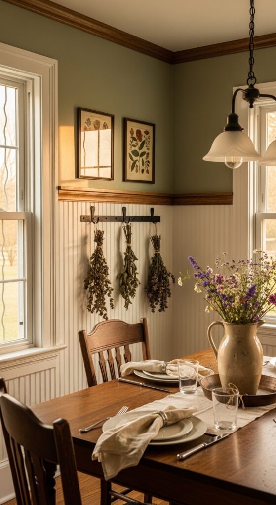 Styling Tips: Paint your beadboard in warm off-whites like Benjamin Moore’s “White Dove” or Sherwin-Williams “Creamy.” Top the wainscoting line with a simple wooden chair rail stained in a warm walnut or left raw. Above the rail, use a muted sage green, dusty blue, or antique linen wallpaper with a subtle botanical print. Layer in vintage hooks for hanging dried herbs, enamelware, or a cluster of old framed botanical prints.