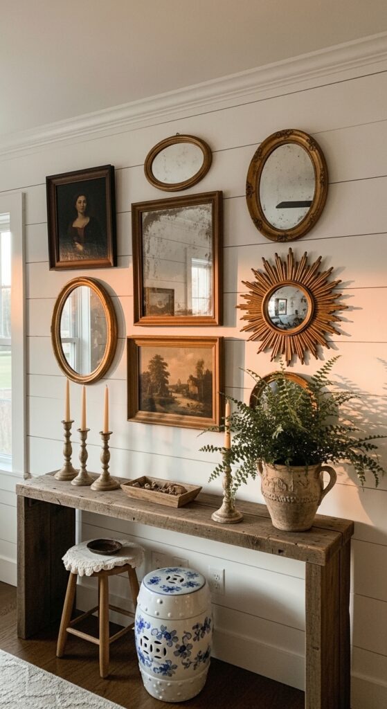 Styling Tips: Use shiplap boards in varying widths for a more authentic, imperfect 1900s feel rather than uniform modern shiplap. Layer your mirror gallery with different shapes — an ornate oval, a simple rectangular, a sunburst — and mix in a couple of vintage oil painting reproductions. At the base of the wall, add a reclaimed wood console table dressed with candlesticks, a ceramic garden stool, and a small topiary or fern in an aged terracotta pot.