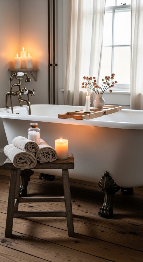 Styling Tips: Choose a clawfoot tub with a classic white exterior and paint the claw feet in matte black or aged bronze for contrast. Position it beneath a window with sheer cotton curtains for natural light. Add a simple wooden bath caddy across the tub holding a book, a candle, and a small vase of dried rosebuds. Mount vintage-style exposed pipe fittings in aged brass, and place a weathered wooden stool beside the tub holding neatly rolled cotton towels and a glass bottle of bath salts.