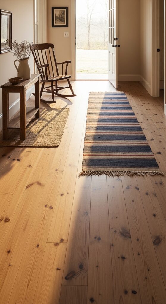Styling Tips: Embrace imperfection — choose reclaimed pine planks or hand-scraped engineered wood in widths of 5 inches or wider for the most authentic look. Avoid high-gloss finishes; instead opt for a matte or satin hardwax oil finish that enhances natural grain without looking plastic. Layer in a vintage-style wool runner in faded red and navy stripes down a hallway or beneath a dining table, and place a worn leather chair or rocking chair nearby on a simple jute rug.