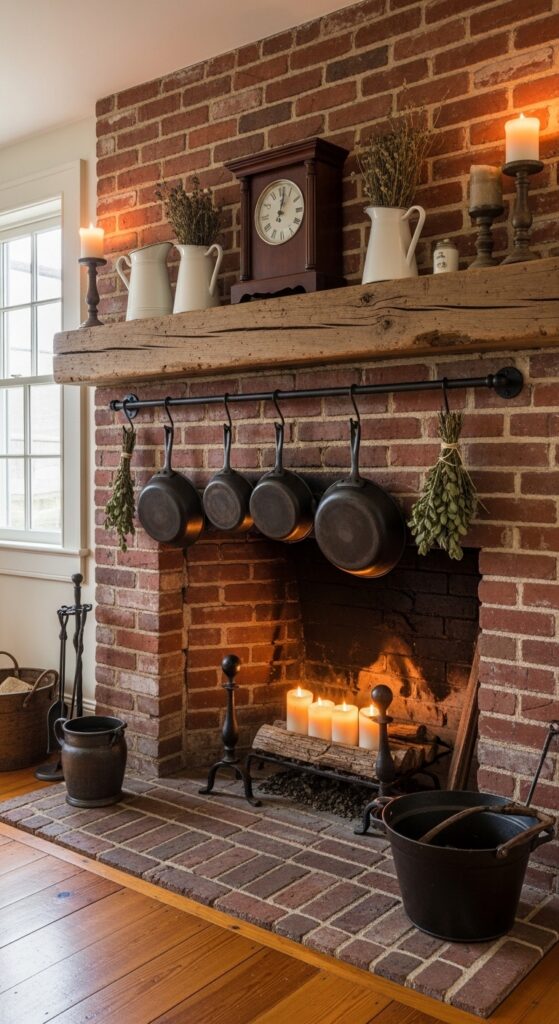 A deep brick hearth with a heavy wooden mantel, cast iron cookware hanging from a wrought iron rod, and the soft crackle of imagined fire — this is the soul of the 1900s farmhouse kitchen.