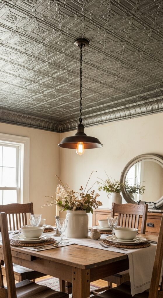 Styling Tips: Choose pressed tin ceiling tiles in a diamond or floral geometric pattern and finish them in aged pewter, antique white, or brushed bronze. Install them in a kitchen, dining room, or butler’s pantry for maximum visual impact. Hang a period-appropriate pendant light in oiled bronze or aged brass — ideally a schoolhouse globe or a vintage Edison bulb cluster — to draw the eye upward and celebrate the ceiling as the fifth wall.