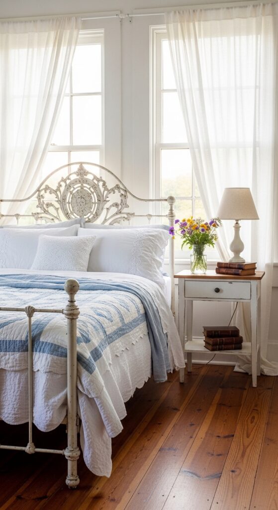 Styling Tips: Choose a vintage or reproduction cast iron bed frame in matte black or aged white. Layer the bedding with a hand-stitched quilt in white or soft blue and cream patchwork, cotton eyelet pillowcases, and a simple linen duvet. Frame the windows with floor-length sheer muslin curtains that sway in any breeze. Add a painted wooden nightstand with a mason jar of wildflowers, a small lamp with a linen shade, and a stack of leather-bound books.