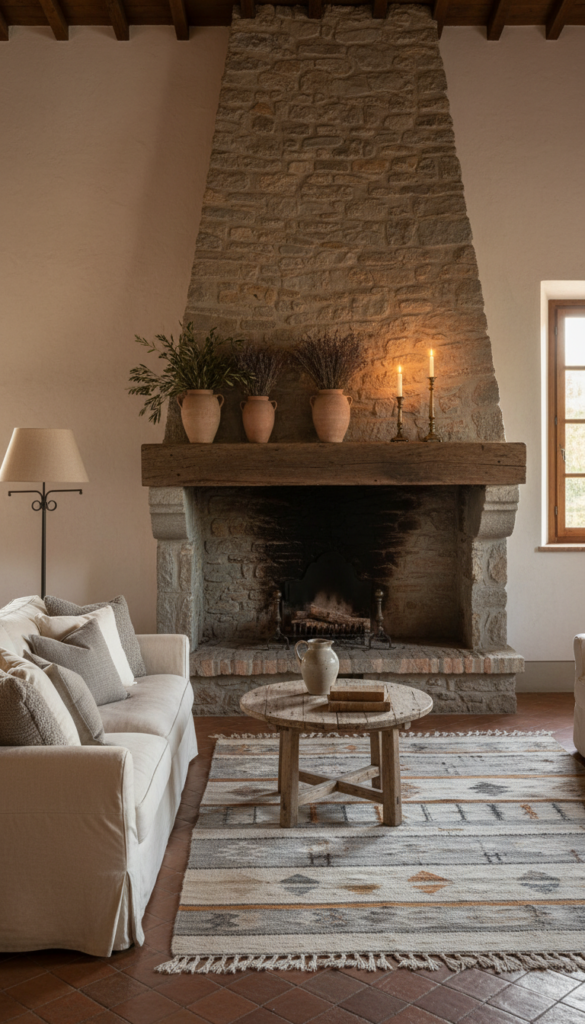 A grand stone fireplace anchors the room with old-world character, its rough-hewn mantel dressed in terracotta vessels and dried botanicals — instantly transporting you to the Italian countryside.