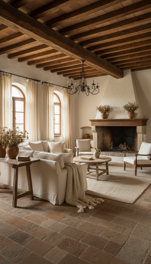 Nothing says Italian farmhouse quite like rough, aged ceiling beams stretching across a whitewashed room — a quiet architectural detail that carries centuries of soulful history.
