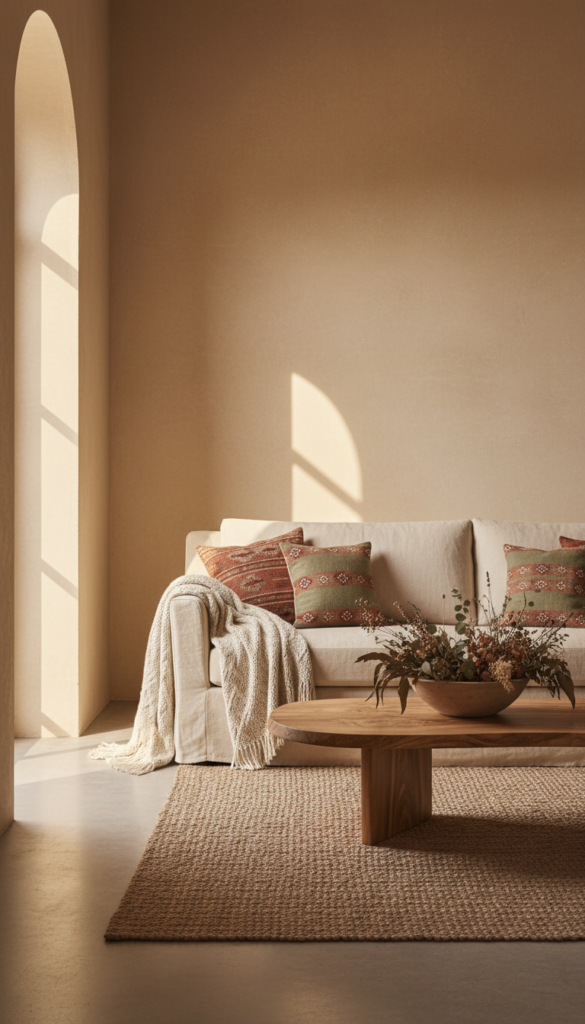 Styling Tips: Choose handmade terracotta tiles with natural variation for authenticity. Layer a Turkish or Persian-style wool rug in faded rose, navy, or rust for depth. Add a raw linen pouf nearby.