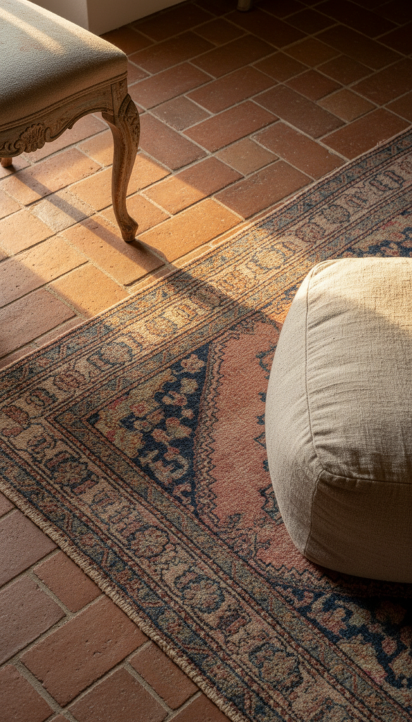 4. Terracotta Floor Tiles with Vintage Wool Rugs