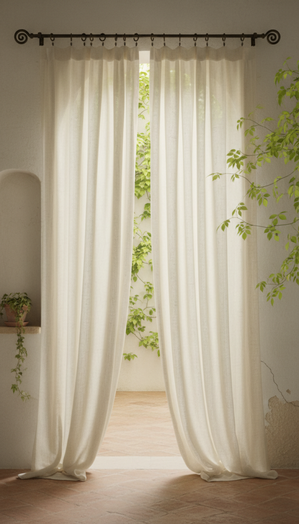 Styling Tips: Use unlined natural linen panels that catch the light. Add a simple iron curtain rod with ring clips. Let the curtains pool slightly on the floor for drama. Frame the arch with climbing greenery if possible.