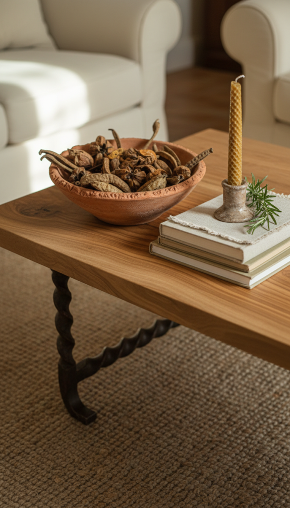 A coffee table crafted from solid olive wood with wrought iron legs becomes the soul of the room — every grain tells a story, and every mark from a coffee cup adds to its charm.