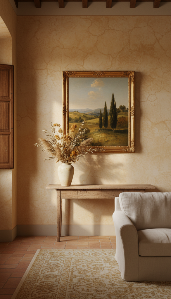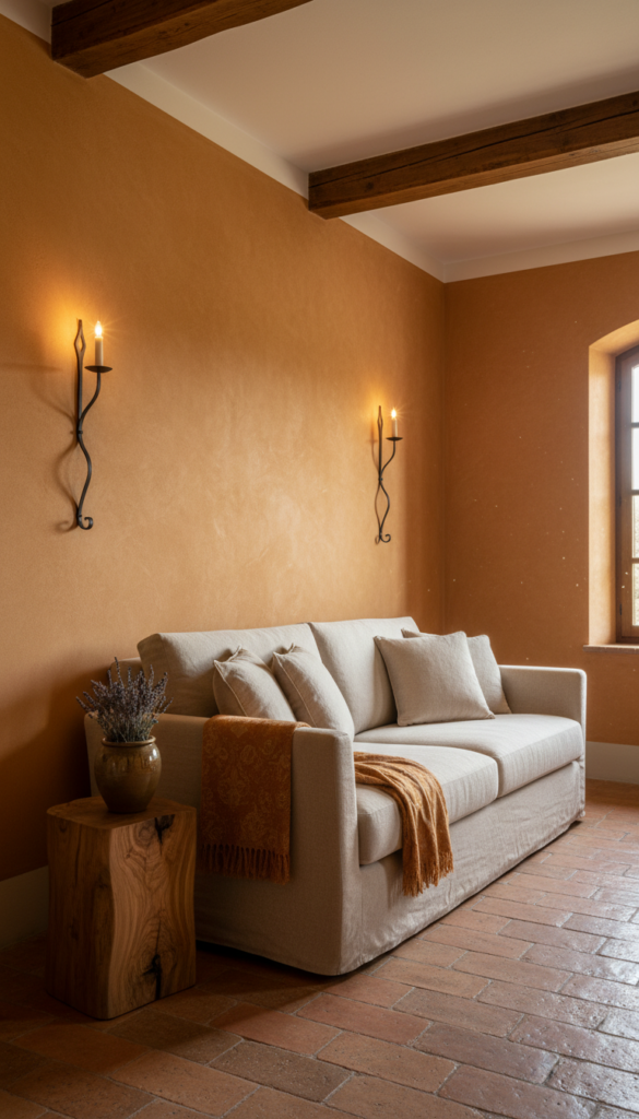 Painting walls in the golden warmth of Tuscan sienna, sun-bleached ochre, or faded terracotta wraps the room in a glow that feels like perpetual late afternoon sunlight filtering through vineyard leaves.