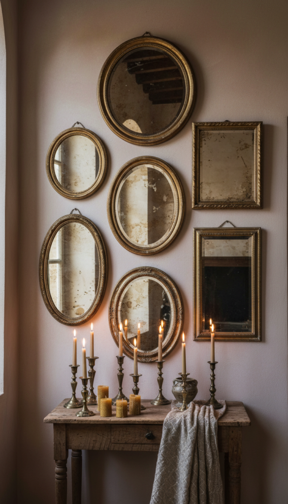 A curated collection of antique mirrors in gilded and tarnished frames transforms a plain wall into a luminous gallery that doubles the warmth and depth of the entire room.