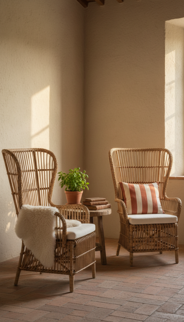 Color Palette: Natural rattan, ivory sheepskin, terracotta stripe, warm sand.