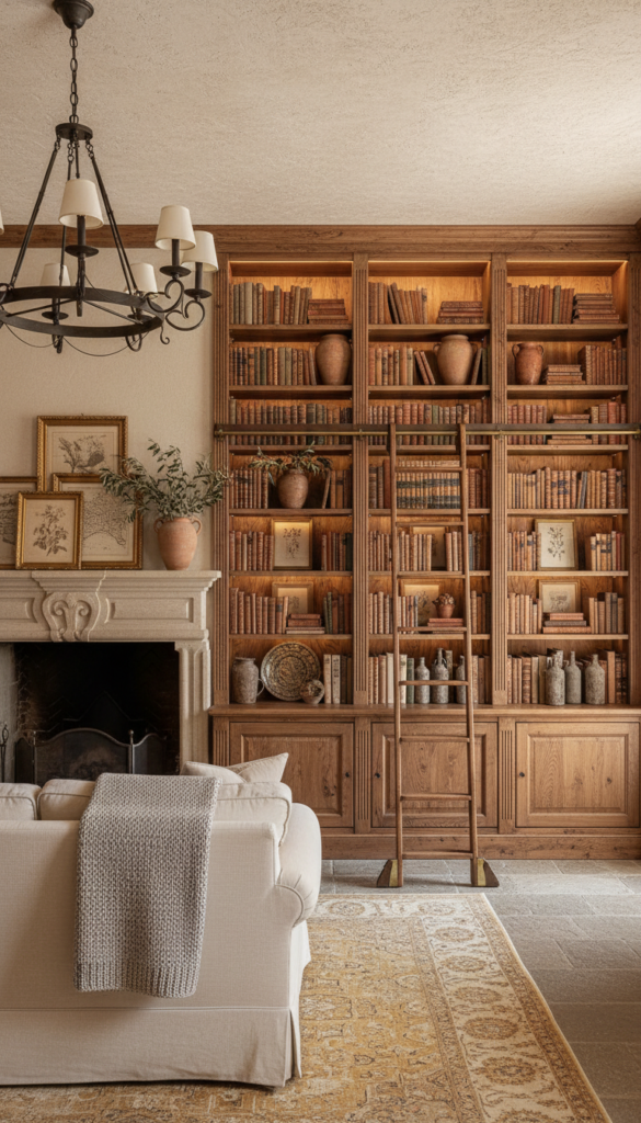 Styling Tips: Style shelves in thirds — books, objects, and empty space. Cluster terracotta vases, old wine bottles, aged maps, and small framed botanical prints. Use a rolling library ladder if the ceilings allow.
