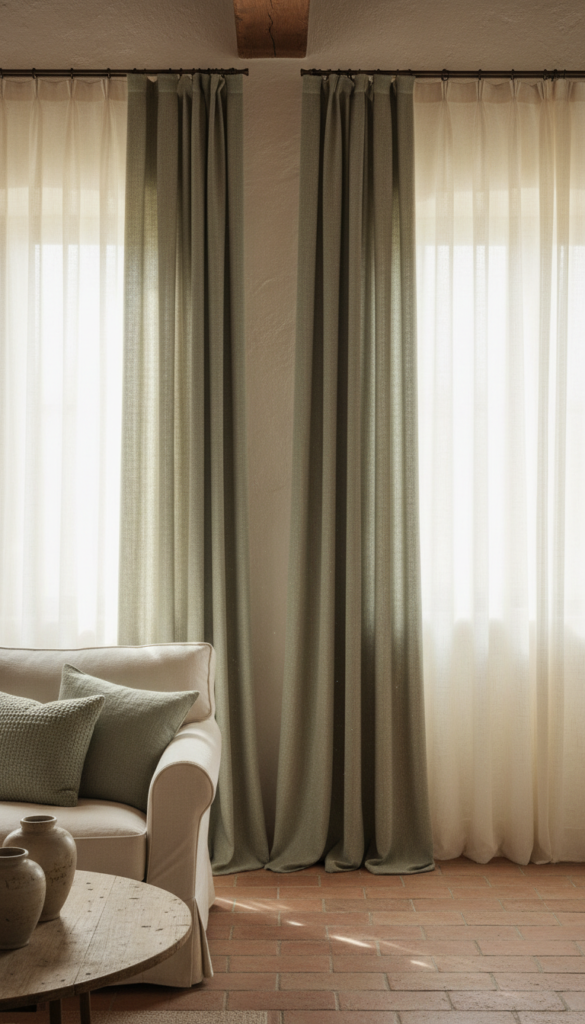 Floor-to-ceiling curtains in heavyweight linen or aged velvet in dusty sage or warm clay pool dramatically on the floor — the easiest way to make a room feel instantly taller, richer, and more intentional.