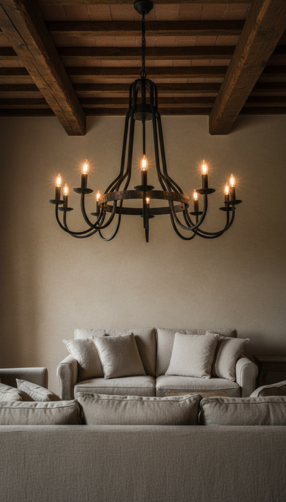 A wrought iron chandelier dripping with candlestick bulbs or actual taper candles is the crown jewel of the Italian farmhouse living room — romantic, sculptural, and utterly timeless overhead.