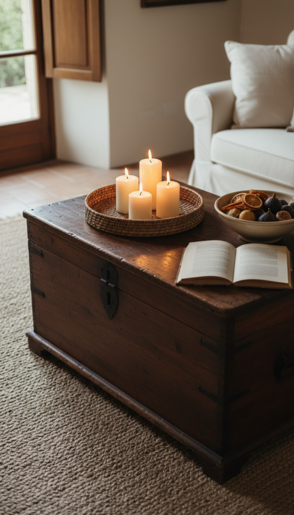 A centuries-old wooden chest sitting at the center of the living room is the ultimate statement piece — practical, historical, and full of mystery, it becomes the conversation before the conversation even begins.