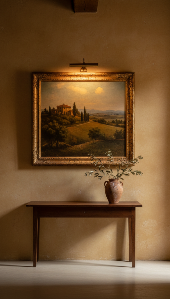 Styling Tips: Go large, go singular. A single great painting beats a gallery wall here. Choose an aged frame — gilded, cracked, or patinated. Illuminate it with a small picture light for gallery drama.