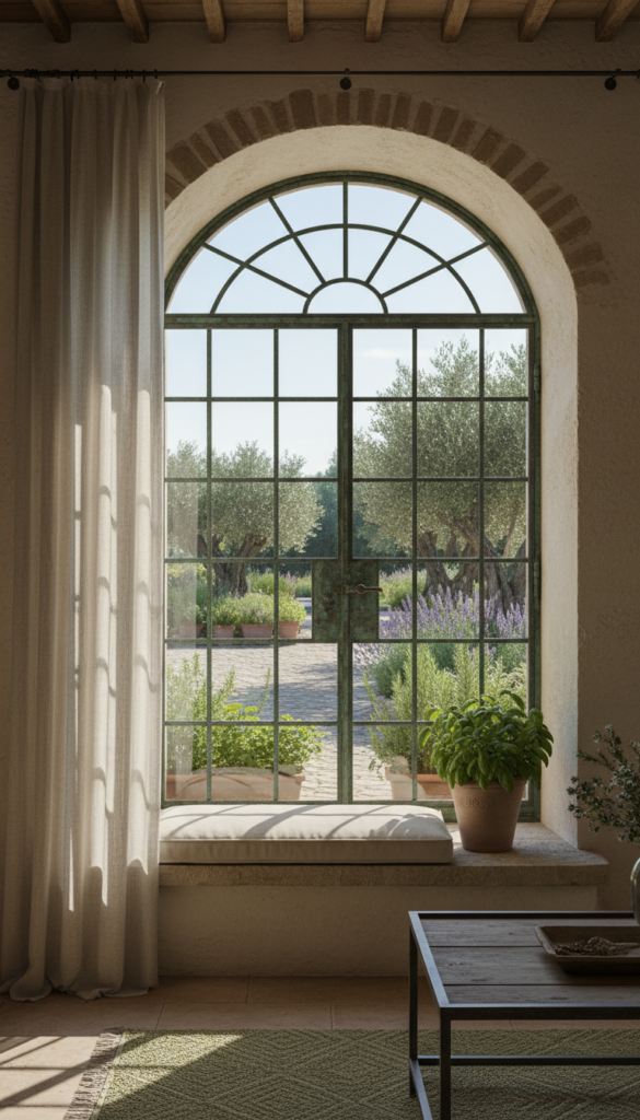 Styling Tips: Keep window dressings minimal — a single sheer linen panel at most. Place a wooden window seat with a flat cushion below. Add a ceramic pot of fresh basil on the sill.