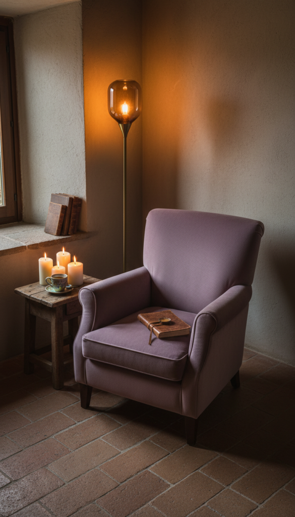 Tucked into a corner with a velvet armchair in dusty plum or aged olive, a floor lamp casting amber warmth, and a small side table with a half-drunk espresso cup — this is Italian farmhouse living at its most intimate.