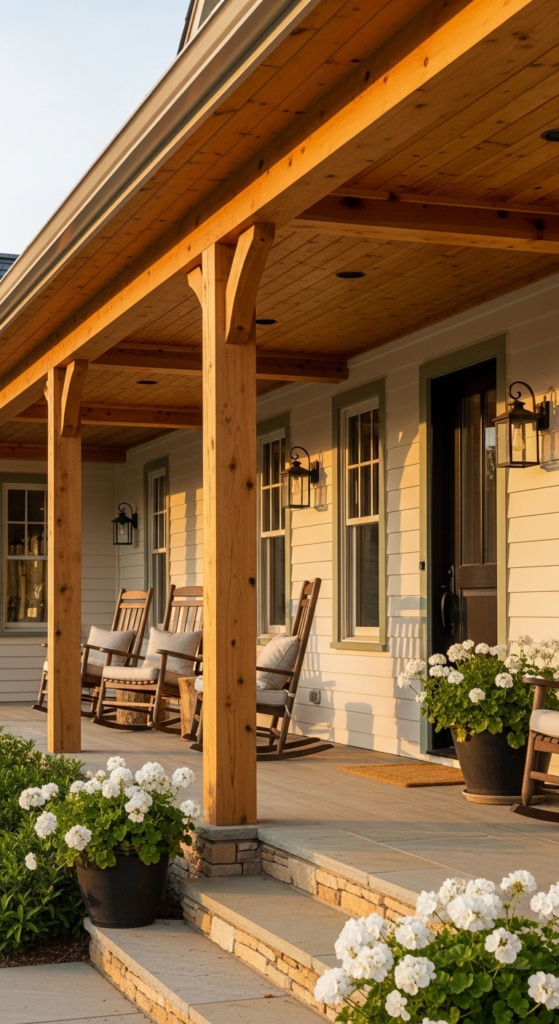 Soft and inviting — warm cream siding paired with cedar wood porch details.