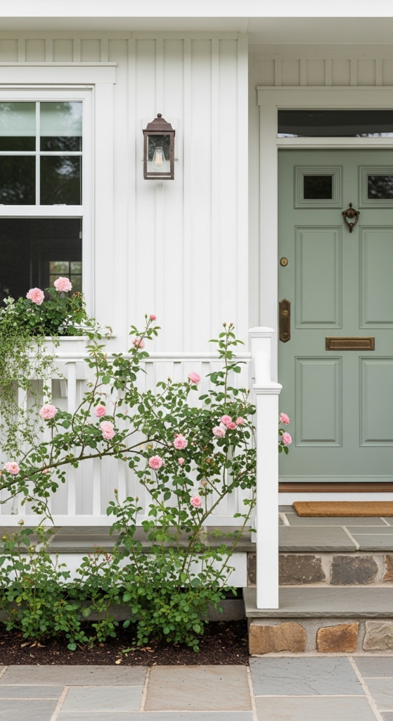 A sage green front door against soft white siding feels fresh and collected.