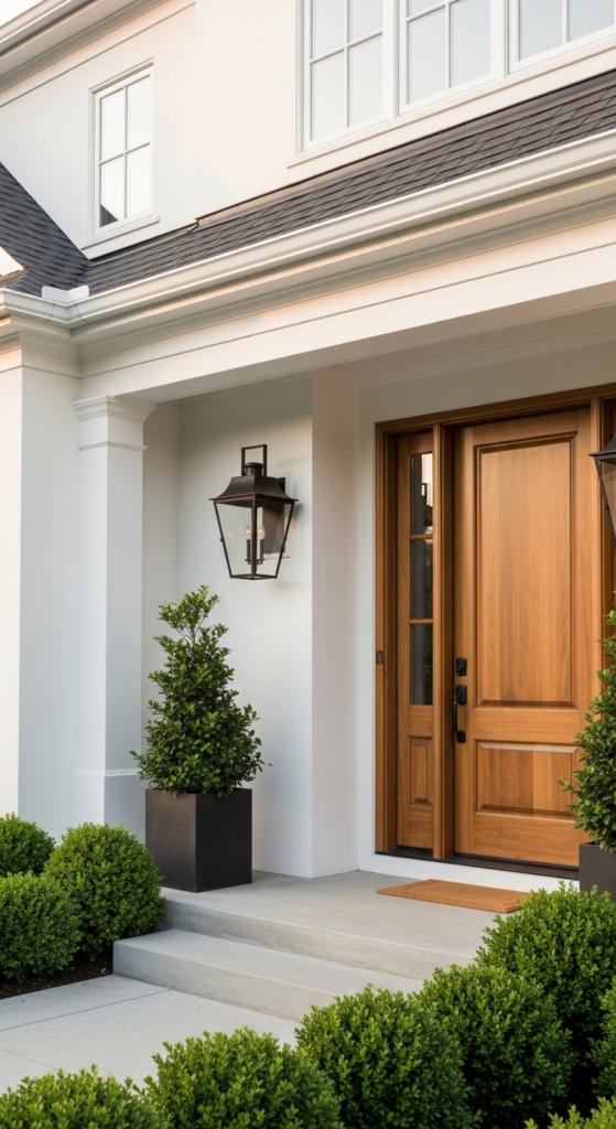 Oyster white siding with a warm stained wood front door — quietly luxurious.