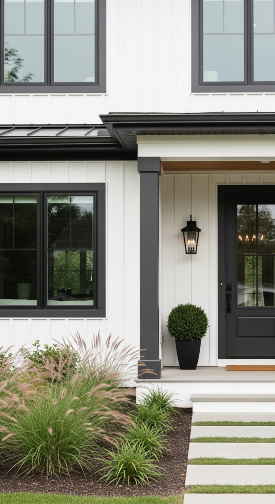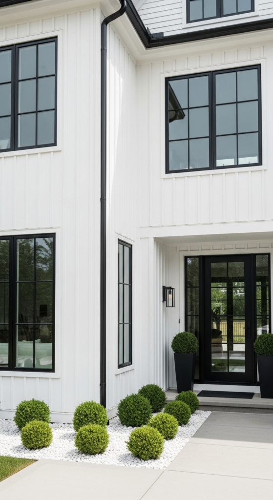 White siding with bold black-framed grid windows — graphic, modern, stunning.
