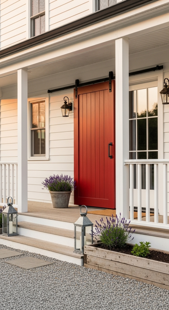 A bold red sliding barn front door against pure white — rustic drama done right.