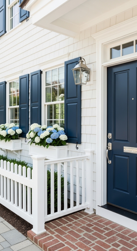 Navy shutters and door against bright white — coastal farmhouse perfection.